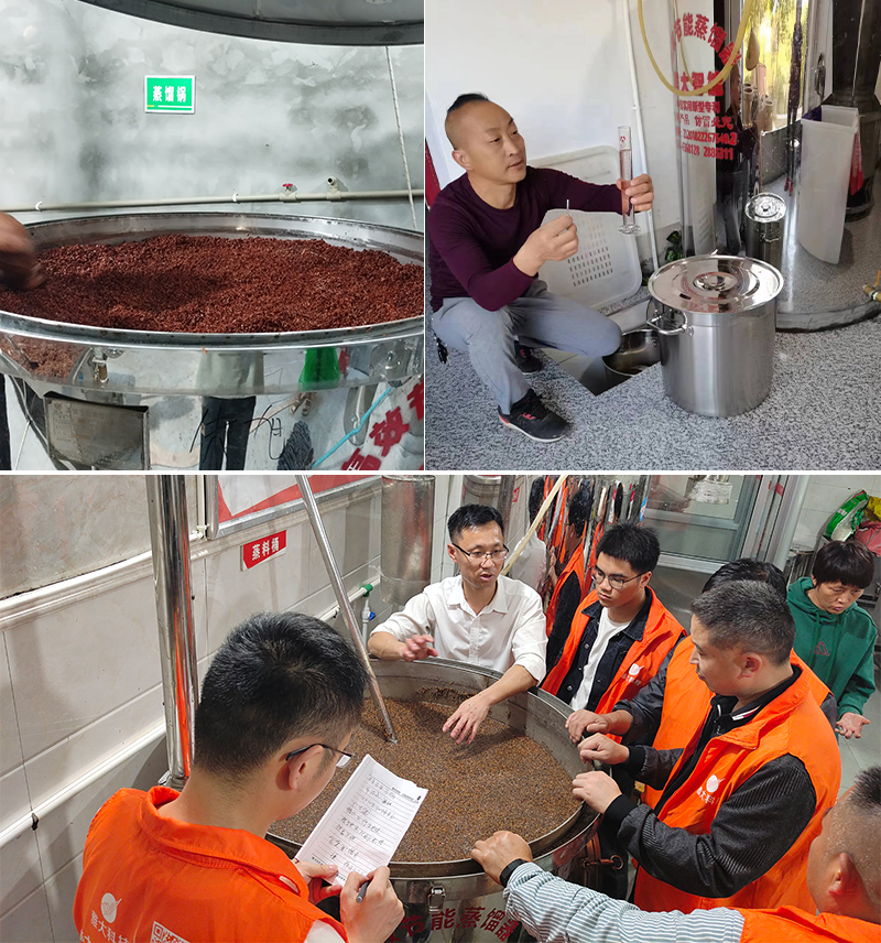 长沙寻总采用高粱固态工艺,但出酒率只有35%。蒋老师上门指导后,发现两个关键问题:一是发酵好的酒醅太湿,二是上甑方法不对导致高度酒少、低度酒多。经过技术改进,出酒率提升到了58%,每100斤粮食多赚300多元!